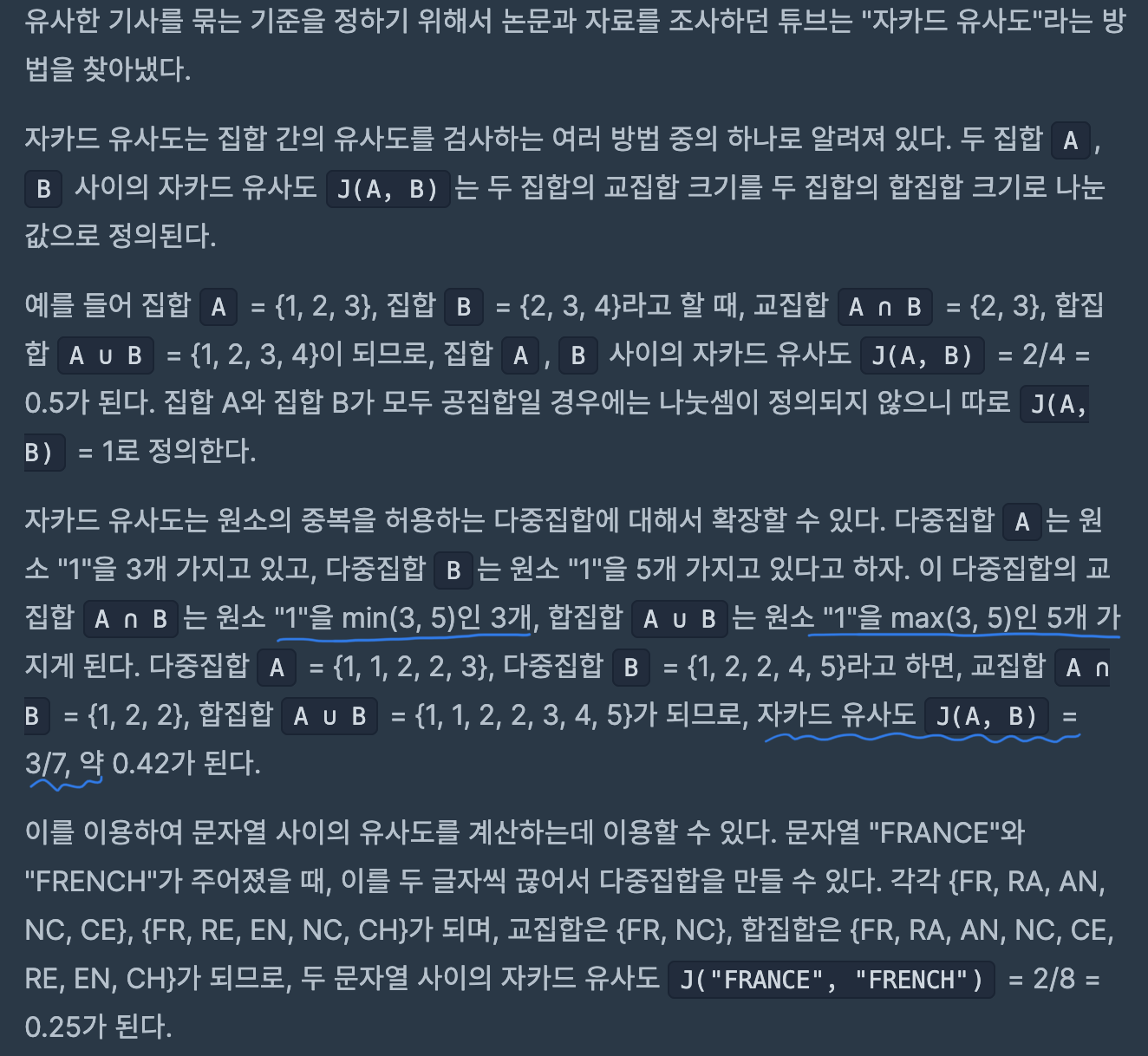 - 자카드 유사도: 교집합 크기 / 합집합 크기