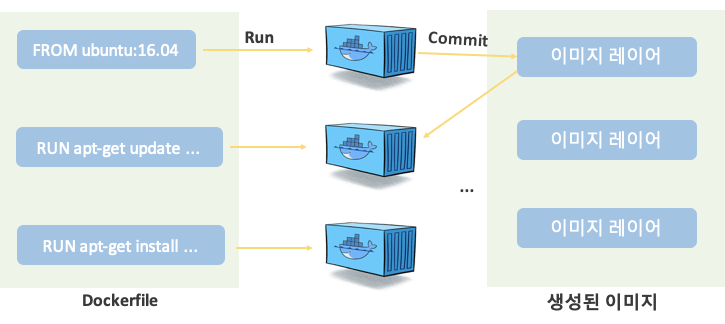 Dockerfile에서 줄 수는 레이어 수를 의미한다. 아래와 같이 도커 파일 명령어가 실행될 때 새로운 컨테이너가 생성되며, 이를 이미지로 커밋하게 됩니다. 따라서 Dockerfile 작성 시, 줄 수을 최소화하는 것이 중요합니다.