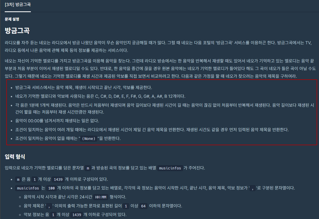 - 조건이 일치하는 음악이 여러 개일 때에는 라디오에서 재생된 시간이 제일 긴 음악 제목을 반환한다. 재생된 시간도 같을 경우 먼저 입력된 음악 제목을 반환한다.