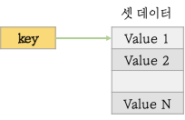 셋 데이터는 순서가 보장되지 않으며 중복이 허용되지 않는 타입입니다. 셋 데이터는 2^32-1개의 값을 저장할 수 있다. 그림과 같이 셋 데이터는 하나의 키에 여러 개의 요소가 저장되며 집합 연산이 가능합니다. 사용 가능한 집합 연산 명령으로는 합집합, 교집합, 차집합이 있습니다.
