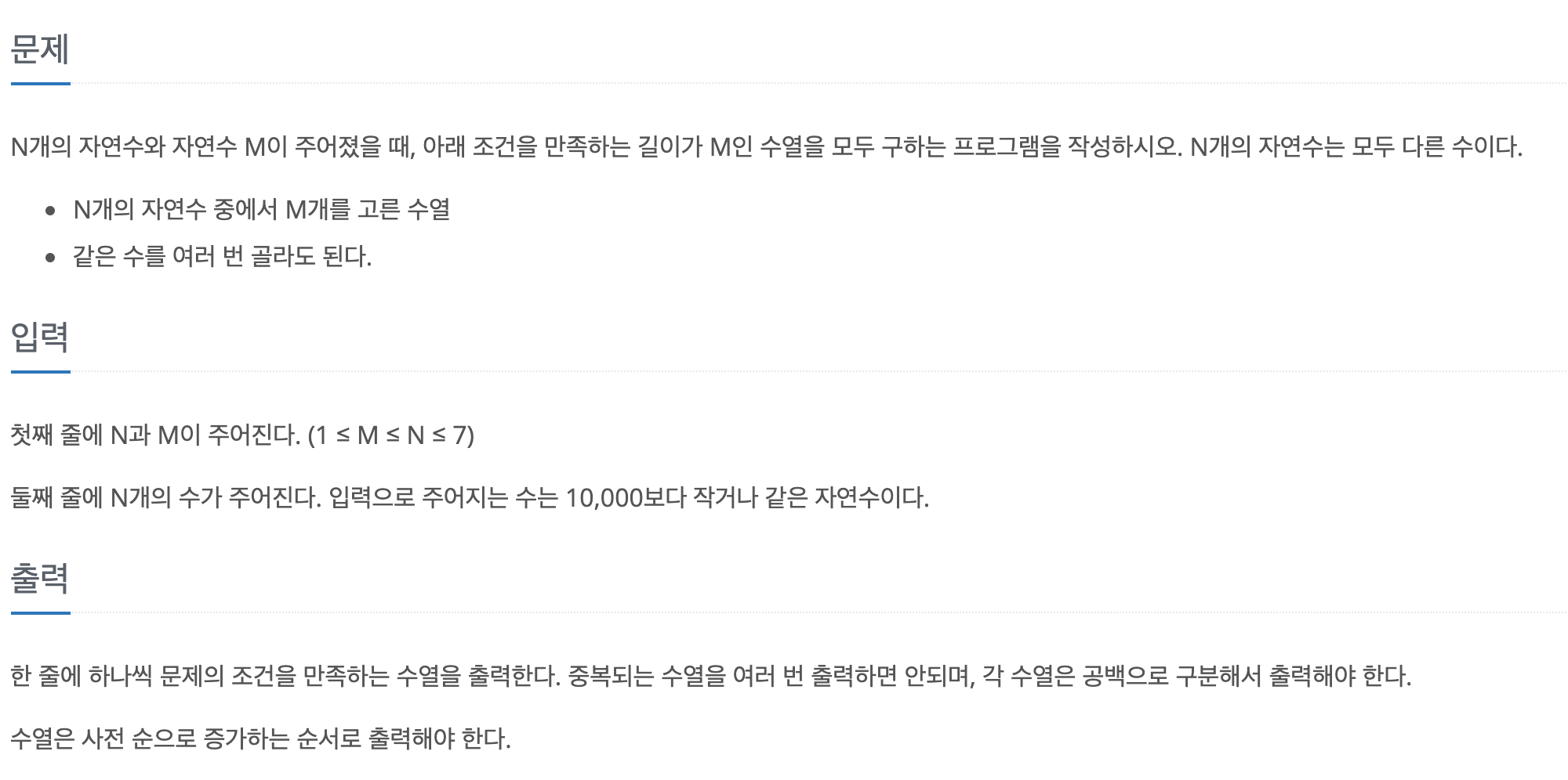 N개의 자연수와 자연수 M이 주어졌을 때, 아래 조건을 만족하는 길이가 M인 수열을 모두 구하는 프로그램을 작성하시오. N개의 자연수는 모두 다른 수이다. N개의 자연수 중에서 M개를 고른 수열