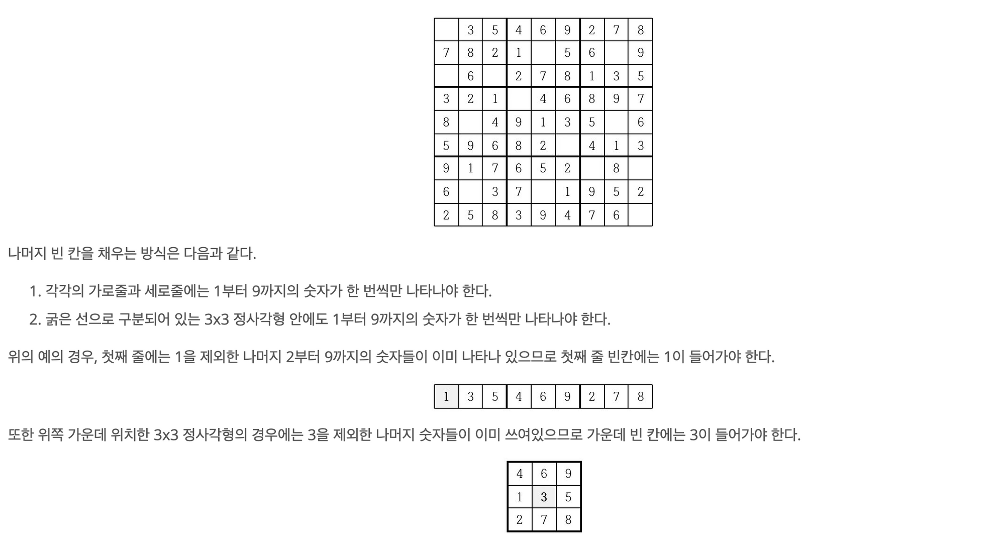 - 각각의 가로줄과 세로줄에는 1부터 9까지의 숫자가 한 번씩만 나타나야 한다.
